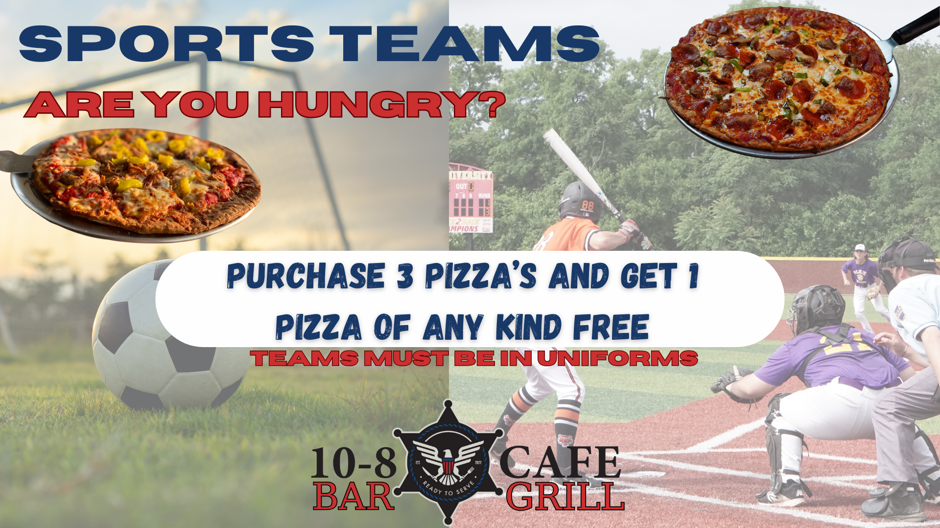 Purchase 3 pizzas and get 1 pizza of any kind FREE – Team must be in uniform!